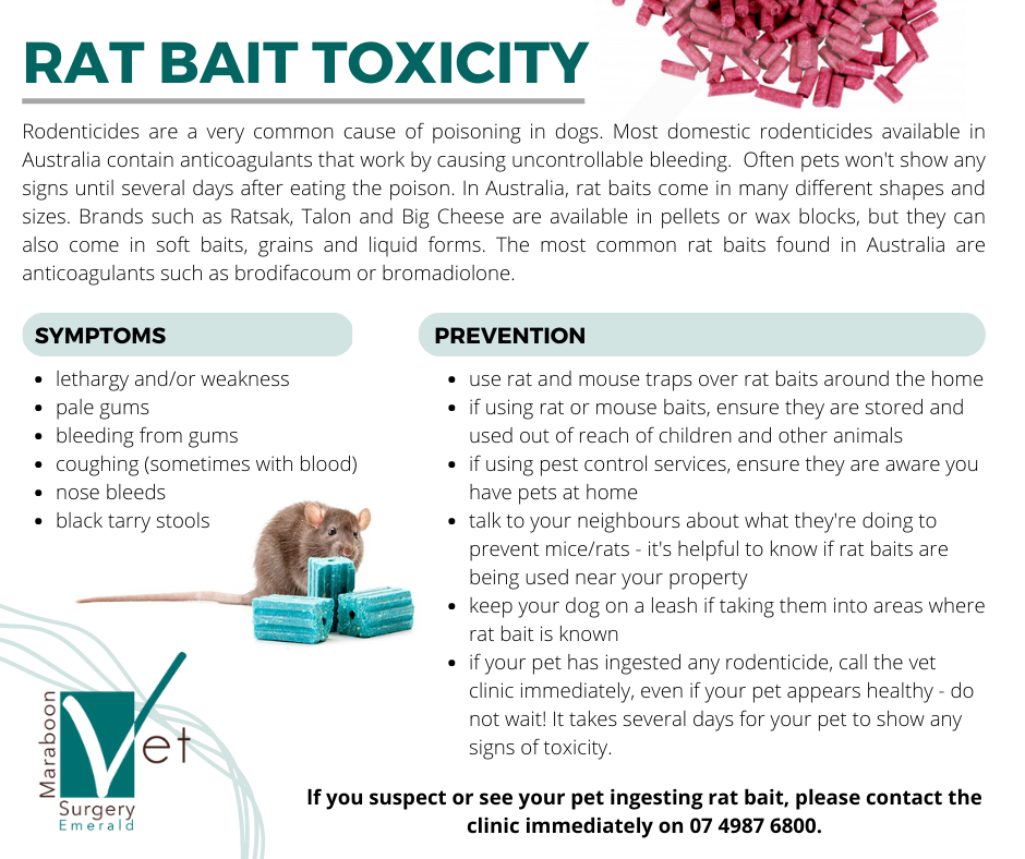 We have recently seen an increase in the number of pets who have been exposed to ‘Rat baits’ and requiring life saving treatments. Rodenticides (Rat Bait) are a very common cause of poisoning in dogs. Most domestic rodenticides available in Australia contain anticoagulants that work by causing uncontrollable internal bleeding. Often pets won't show any signs until several days after eating the poison. In Australia, rat baits come in many different shapes and sizes. Brands such as Ratsak, Talon and Big Cheese are available in pellets or wax blocks, but they can also come in soft baits, grains and liquid forms. The most common rat baits found in Australia are anticoagulants such as brodifacoum or bromadiolone.